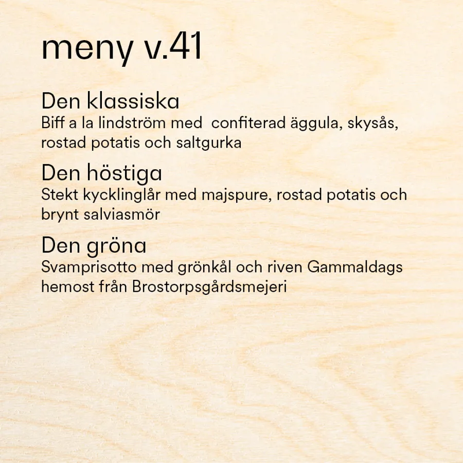 I vår restaurang vill vi att matupplevelsen ska vara lika intressant och hållbar som en vacker trämöbel eller ett robust trähus. Hos oss är råvarorna äkta, maten omsorgsfullt tillagad och en fröjd för ögat.